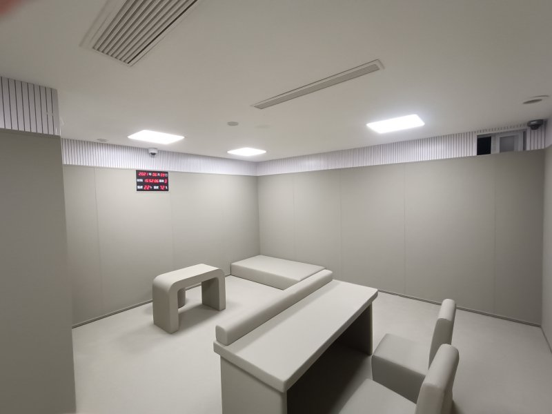 紀(jì)檢監(jiān)察談話室配置主要是整體墻面軟包防撞:采用聚乙稀防撞軟包為主體,配合踢腳線、中線、收邊條、上收口條進(jìn)行建設(shè)墻面軟包防撞安裝;使用規(guī)格為1250*2450mm的尺寸,厚度選用20mm或30mm;顏色選用淺灰色,耐臟易清洗;為安全著想,選用的軟包全部是達(dá)到阻燃B1級,環(huán)保E0級的材料。還要在考慮到談話室需要錄音等,室內(nèi)要很好的吸音降噪效果,所以常規(guī)都會在墻面高于2.45米以上的地方可以用紅芯阻燃木質(zhì)吸音板進(jìn)行安裝,達(dá)到整體留置室的吸音降噪效果,從而確保談話室的錄音質(zhì)量。