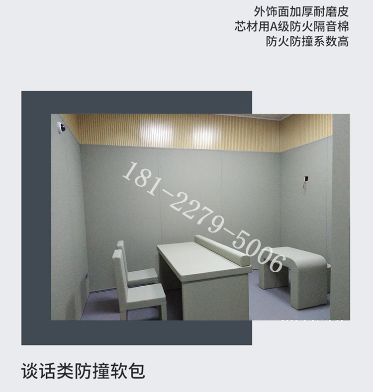 審訊室防撞軟包,是一種獨(dú)特的阻燃防撞材料,兼具阻燃、環(huán)保、防水、防撞四大特點(diǎn),目前還廣泛應(yīng)用在紀(jì)檢委、派出所、看守所、監(jiān)獄、拘留所、談話室、留置室、詢問室、辨認(rèn)室、辦案區(qū)、衛(wèi)生間等機(jī)關(guān)場所。具有阻燃、環(huán)保、防水、防撞+吸音板安裝可以達(dá)到吸音效果。
