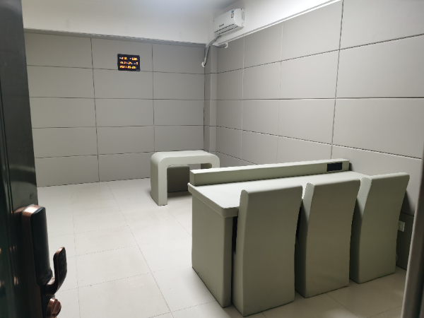 審訊室面積為15-30平方,一般設置2臺全景攝像頭及1臺特寫攝像頭,1臺在線視頻系統(tǒng),通過聯(lián)網服務器進行遠程指揮及同步錄音攝像,房間內配備示證視頻系統(tǒng)。配備辦公和談話桌椅,辦公和審訊桌椅均采用軟質包覆,無安全隱患,配備多媒體排口系統(tǒng),方便辦公人員的電器設備,及視頻系統(tǒng)?!檫M一步防止被審訊人的人身安全,以頭撞墻產生以外,墻面應用厚度大于2cm阻燃防撞軟體材料進行覆蓋,絕對不允許意外事件的發(fā)生。室內電器設備安裝不規(guī)范有可能導致意外事件的發(fā)生。因此室內所有的電器設備的電源插座,開關都建議采用集中控制的方式,由電腦控制開關,手動控制器和集線箱應安裝在過道或監(jiān)控房內。為防止意外事件的發(fā)生,不建議使用公共衛(wèi)生間給被談話人使用。所以每間房間必須有獨立的衛(wèi)生間,所有馬桶及洗手盆必須軟包處理,并安裝隱蔽攝像頭。